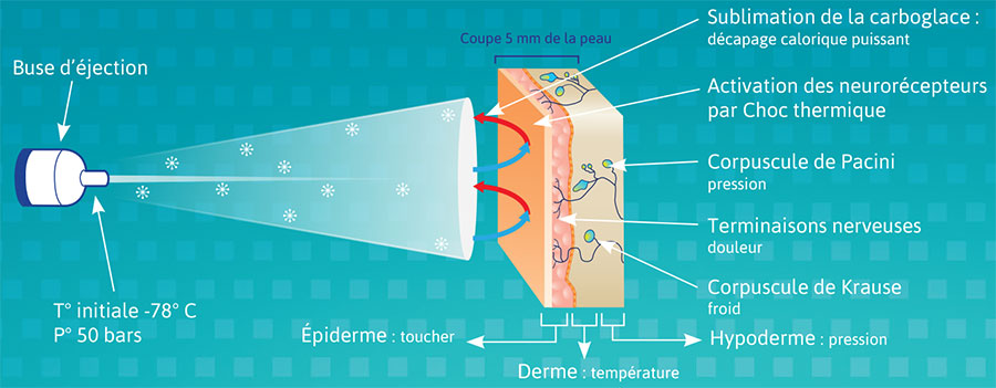 Le dioxyde de carbone à -78°C et 50 bars de pression permet de faire chuter la température cutanée de 32C° à 4°C en 30 secondes.